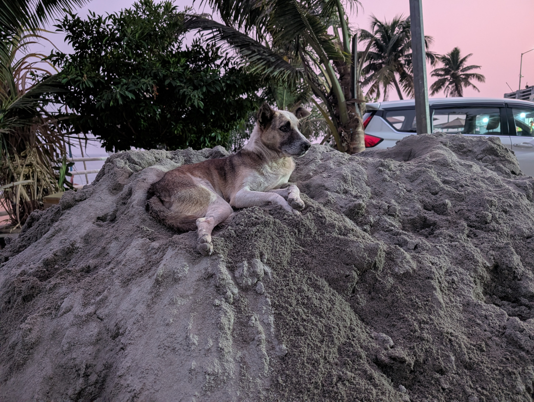 We have a real dog. Look at him! Laying down on the filthy scratchy bricks. So comfortable, so unconcerned.